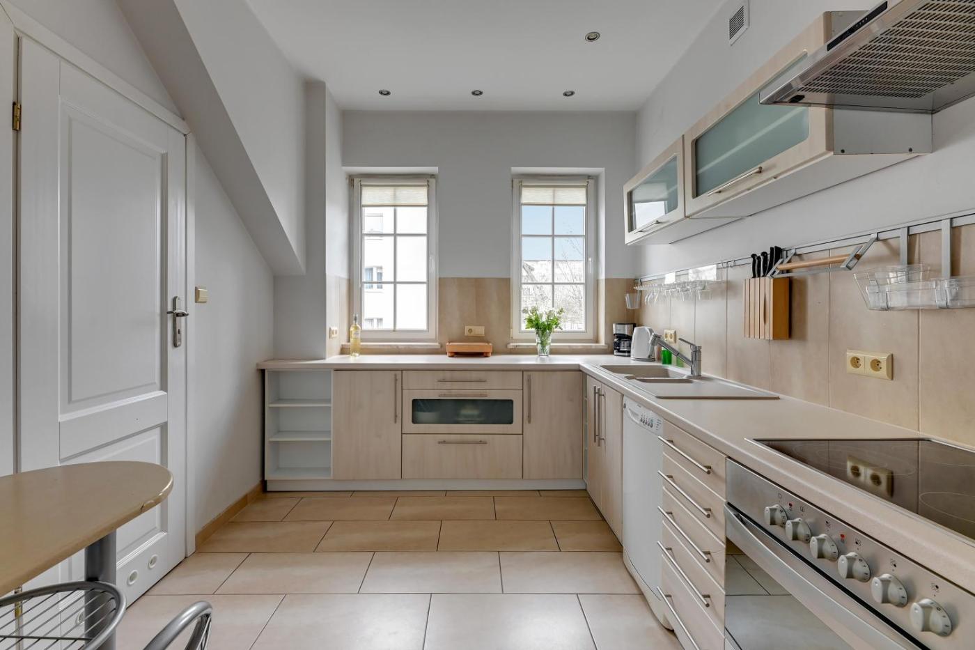 Apartament z 2 sypialniami. This spacious apartment includes a kitchen, a seating area, 2 separate bedrooms and 1 bathroom with a bath and a shower. In the well-fitted kitchen, guests will find a stovetop, a dishwasher, kitchenware and an oven. The apartment offers a flat-screen TV with cable channels, a washing machine, soundproof walls, a tea and coffee maker as well as garden views. The unit has 2 beds. Apartament - 4 osobowy. Powierzchnia pokoju ok.: 80 mkw.