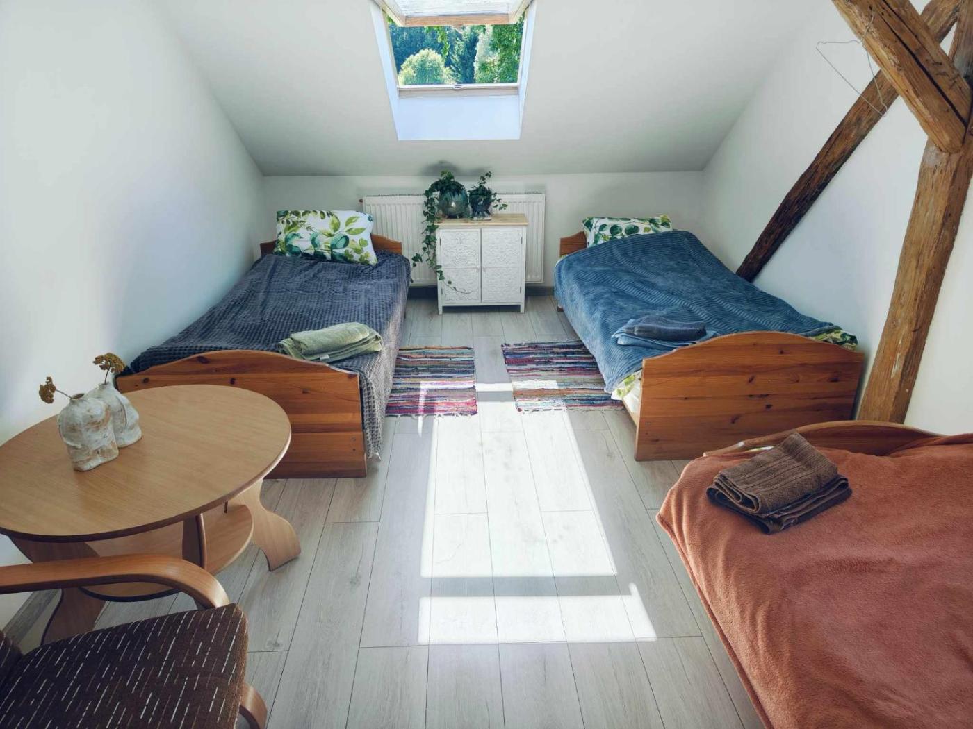 Pokój Trzyosobowy typu Basic ze wspólną łazienką. The triple room offers a tea and coffee maker, a dining area, a balcony with lake views as well as a shared bathroom featuring a shower. The unit offers 4 beds. Pokój Trzyosobowy - 4 osobowy. Powierzchnia pokoju ok.: 20 mkw. ;